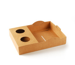 Stapelbare Kartonschalen in Kraftfarbe, perfekt für ein vollständiges Street Food-Menü. Es besteht aus 2 Lochungen für Gläser und einer sehr weiten Vertiefung für Speisen. Ihre Kunden können problemlos ihr Getränk, ihr Essen, ihren Kaffee oder ihr Dessert im gleichen Tablett mitnehmen! Außerdem sind sie stapelbar, sodass Sie problemlos mehrere Menüs mit einer Hand transportieren können. Wenn Sie einen Imbisswagen haben oder Street Food Events veranstalten, ist dieses stapelbare Tablett die vielseitigste und komfortabelste Lösung.